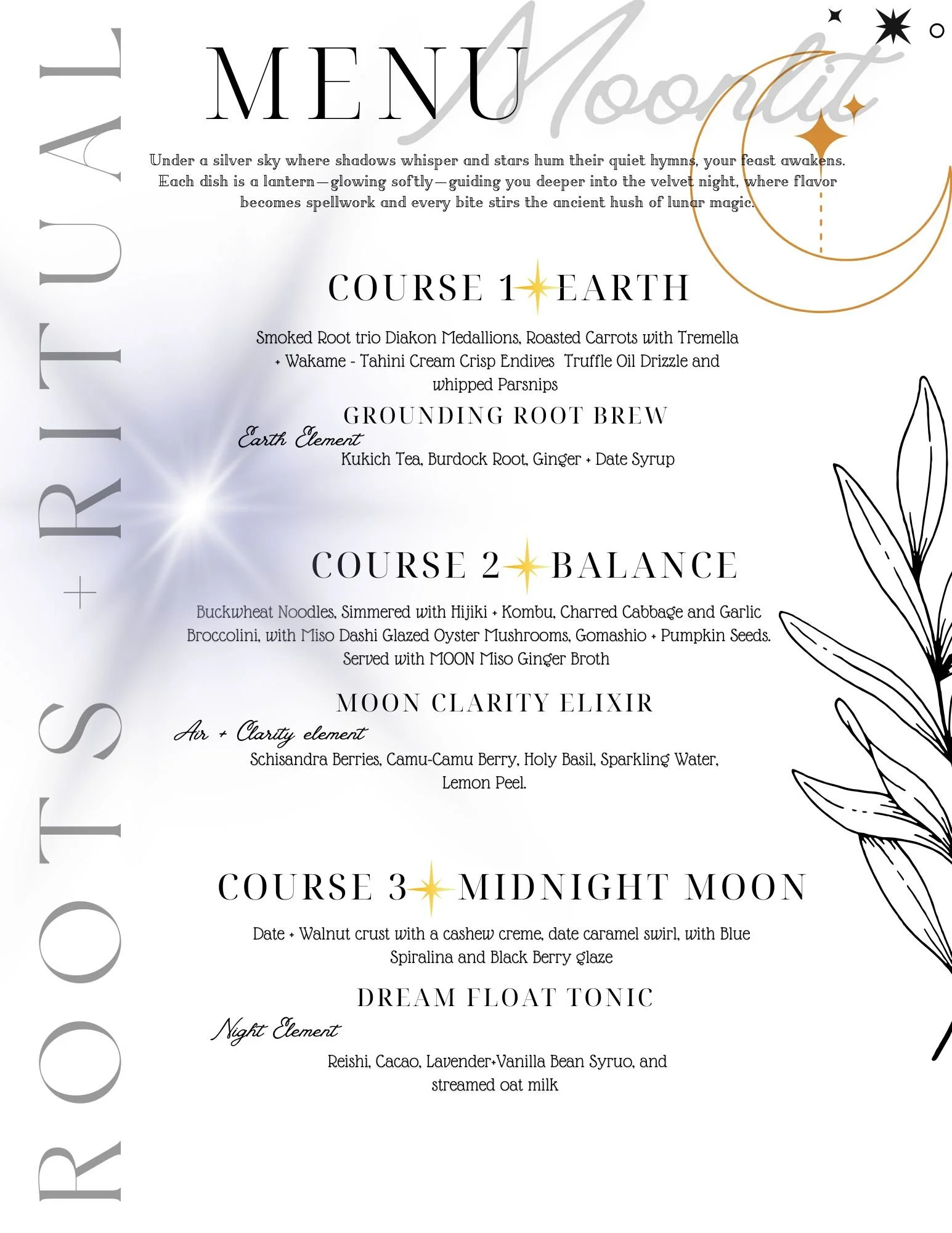 Three courses + three alchemical tonics designed to ground, awaken, and elevate you into the velvet hush of late winter.